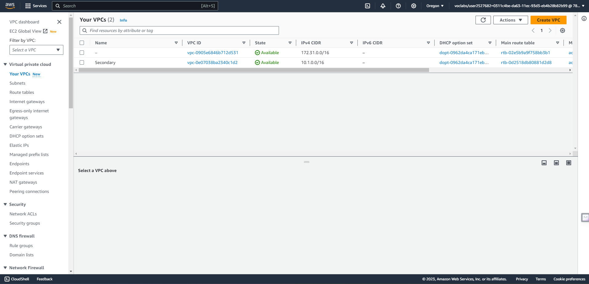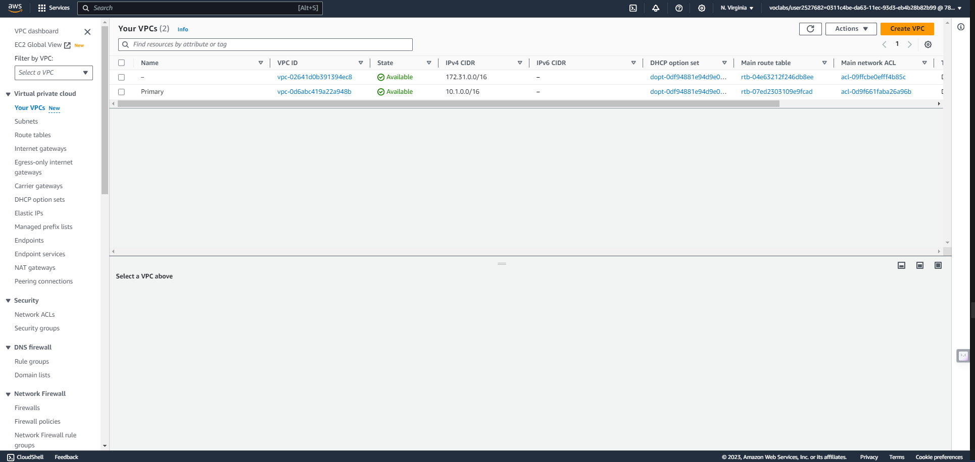 Pick two AWS regions. An active region and a standby region ( us-east-1 and us-west-2 regions ) Use CloudFormation to create one VPC in each region. Name the VPC in the active region "Primary" and name the VPC in the standby region "Secondary".